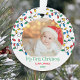 Décor de Noël avec lumières de Noël colorées et libellé modifiable. Le modèle photo est mis en place pour vous d'ajouter une de vos photos préférées, qui sera encadré avec des ampoules à cordes en bleu rouge vert et jaune. Le libellé est actuellement Mon premier Noël [nom] 20xx et vous pouvez le modifier comme vous le souhaitez.
