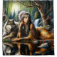 In a tranquil forest setting, a native Indian woman adorned in vibrant traditional attire rests peacefully beside a majestic wolf. Surrounded by lush greenery and cascading water, the bond between the two reflects harmony and connection with nature.
