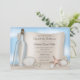 Invitations de mariage à la plage, exclusivement conçues par Artistly Invited, avec une illustration d'une bouteille en verre avec un message en papier abîmé dans le sable, avec coquillages, dollars de sable, et une étoile de mer. Les détails de votre mariage personnalisé sont imprimés en marron sur l'illustration papier. Ce sont les invitations parfaites pour vos fêtes de mariage sur le thème de la plage.