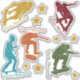 Ajoutez des noms ou un slogan court à ces 5 autocollants de style découpé. Vous pouvez ajouter un texte différent à chaque autocollant ou le même message sur chacun d'eux. Il y a cinq autocollants de style silhouette illustrations d'autocollants dans un jaune moutarde, rouge foncé, orange rouille, bleu turquoise et vert plus quelques étoiles autocollants accent.