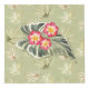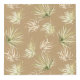 Tri-colour colorway in a subtle tropical harmony of a blendable khaki and gentle green palette. Messy palm leaf pattern with green background is centred with Plumeria blooms and a large tropical leaf on one side. Leaf pattern with khaki alone on the opposite.