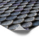 Close up photograph of ancient metal armour plates creating a unique textured pattern of light and shade.