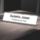 Personalize our changeable desk name plate with recipient name, job title, or other custom text. Designed in white and other colours (all colours are customizable). Available in different metal colours in two sizes – standard 2 inch x 8 inch or long 2 inch x 10 inch – and in two styles – as a desk name plate or a door name plate. No minimum order quantity and no setup fee.