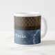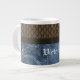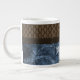 Cool and unique Metal Gear Steampunk Jumbo Mug in dark blue featuring a pattern and steampunk gear background at the bottom and a metal mesh digital art background on the top. This super chic mug is full of quirky and offbeat flair and is perfect for enjoying your coffee or tea! Easy to customize, simply add the personalized text of your choosing in the text field provided. Click on "Customize It" to find additional personalization options.