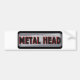 Word, “Metal Head” written in simple black font shadowed in dark blood red, all on a torn piece of diagonal white tape, stuck to a treaded metal background in a black frame with rounded edges.