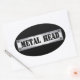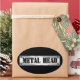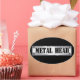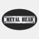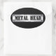 Word, “Metal Head” written in simple black font on torn pieces of diagonal white faded cloth, on a treaded metal background, with steel bolts located in each corner, all in a black frame with solid clean edges.