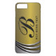 Metal silver grey stainless steel look-not real just a printed image- and gold monogram iPhone 7 plus case template. A modern monogrammed design, featuring shiny metal silver grey curves with black outline and your monogram/initial on glowing gold background. Click on “Customize it” to have a better result and choose colour, and place for your initial.