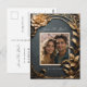 Capture the magic of your love story with these enchanting Save the Date photo postcard from the 'Theatrical Reverie Wedding Collection.' Immerse your engagement photo in a frame of golden copper metallic floral foliage, set against a textured, subtly ornamented charcoal black background. Evoking the allure of vintage theatres and masquerade charm, this design adds a touch of theatrical drama to your announcement.