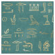 This bold design has metallic gold Egyptian-inspired hieroglyphs on a green background.