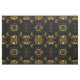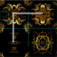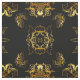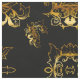 A very elegant fabric pattern featuring large, sweeping metallic gold ornaments with ornate leaves and swirls, scattered across a black background.