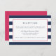 Designed to coordinate with our preppy chic pink and navy Metro Stripe wedding and event invitations, this simple and chic reception information card features a background of wide horizontal stripes in classic navy blue and white, with your wedding reception details in a mix of modern block and traditional script typography styles in rich midnight blue. A thin border in vibrant bright fuchsia pink adds a contrasting pop of colour. Add your key details like reception timing, location and transportation or parking using the fields provided.