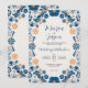 This Mexican Blue Orange Floral Elegant Fiesta Wedding Invitation design features an intricate floral pattern that wraps around the border, showcasing delicate blue and orange flowers interwoven with curling vines and leaves. The colour palette, consisting mainly of soft blues with touches of warm orange, creates a harmonious contrast, evoking a hand-painted, artisanal quality. The symmetry of the design along with the detailed floral motifs adds a traditional, handcrafted charm, reminiscent of Mexican folk art.