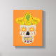 This awesome canvas print features a graphic design image of a Mexican Day of the Dead (Dia de los Muertos) inspired skull. The skull is a pale grey colour and is wearing a yellow sombrero. It has gold teeth and Mexican Sunflowers, also called Tithonias< instead of eyes. The sombrero has a cactus on it and is covered in pretty swirl patterns and red and green Chilli peppers. The skull itself is covered in pretty coloured flowers of different types.