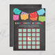 Mexican Fiesta Baby Shower Bingo game card on a dark chalkboard background with papel picado banners.
