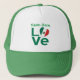 Design, on trucker hat, shows the word LOVE, in green letters, with a heart shaped Mexican flag for the O. Fun hat for Cinco de Mayo or any special occasion. Personalize with a name, above the design. The flag is green, white, and red with an eagle in the centre.