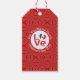Personalized gift tags with the Mexican LOVE FLAG. The word LOVE, using a heart shaped flag as the O, is featured in red letters inside a white, fractal circle of squiggly squares. The circle sits on a red, fractal background, also, of squiggly squares. Great for your guests at your next occasion or party to celebrate Mexico. Can be customized for Cinco de Mayo or any occasion.
