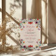 This Mexican Folk Art Floral Botanical Fiesta Wedding Invitation design features an intricate floral border in vibrant hues of red, pink, orange, and blue, creating a cheerful and lively frame for the invitation. The flowers are arranged with swirling vines and leaf motifs, giving the composition a harmonious flow and adding a sense of movement to the design. Small decorative details, such as dots and teardrop shapes, enhance the festive and folkloric feel, making this layout perfect for a joyful wedding celebration with a Mexican-inspired theme.