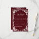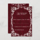 Celebrate your special day with this Burgundy Rustic Wedding RSVP Card, inspired by rustic elegance and natural earthy tones. Delicate white floral lace motifs on a warm Burgundy background create the perfect blend of rustic charm and timeless beauty. Ideal for outdoor, boho, or destination weddings, this RSVP card coordinates perfectly with the matching Burgundy Rustic Wedding Invitation and is fully customizable with your own wording and colors.