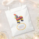 Fun white paper favour bag with graphics of a colourful donkey pinata. A yellow scallop edged oval text area, has colourful text ready to personalize for your fiesta style event.