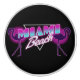 Retro style "Miami Beach" text design illustration with flamingos and triangle decoration in vibrant blue, white and pink colours on halftone background
