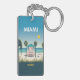 Retro Miami Florida travel poster illustration that features a view of a lifeguard station on a palm-tree-lined, sunny and sandy Miami Beach. This vintage design will bring back memories of classic travel posters from a bygone era.