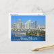 Welcome to Miami, Florida! Miami offers an unparalleled multicultural experience, all against a beautiful beach backdrop. This fun postcard features the Miami Skyline and harbour with clear blue skies.