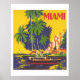 Miami Florida poster adapted from a 1930s tourism promotional piece of the time. Vintage illustration style shows people boarding a boat. with palm trees and the city of Miami buildings in the background. A wonderful classic representation of old Florida and the history of Miami. The name "Miami" is in red at the top right corner.