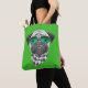 This design features a portrait of pug in with sunglasses and a black and white chequered scarf.
