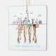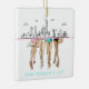 Celebrate your Miami bachelorette trip with this chic personalized ornament featuring a modern Miami skyline and four stylish ladies in cute bathing suits from the waist down. One holds a straw hat with “Bride to Be” for the perfect beachy spotlight moment.