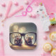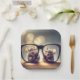 Two adorable mice are seen peeking through the lenses of a pair of oversized glasses