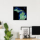 The state of Michigan from space is depicted in this glossy satellite map/print. The data for this satellite photo has been enhanced topographically to bring out terrain features. Additionally, this satellite map has county lines (no names), names of some major metropolitan areas and the state flag.