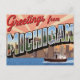 Step back in time with this retro-inspired "Greetings from Michigan" postcard. Featuring classic large-letter design elements, this vintage travel artwork captures the spirit of the Great Lakes State, showcasing a vibrant cityscape, waterfront, and iconic architecture. Perfect for Michigan residents, tourists, collectors, or anyone who loves US state travel and Americana style. Use it to send a unique greeting or display it as small, framed art.