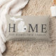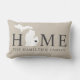 Stylish welcome pillow features a typography design with "Home" text and Michigan state map. The soft black / onyx heart city marker can be positioned over the city where you live via Customize. Personalize with your family monogram or your home town city name. Beige, soft black, and white colours. A pattern of horizontal stripes dresses up the back of the pillow.