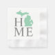 Stylish paper napkins feature a typography design with "Home" text and Michigan state map. The navy blue heart city marker can be positioned over the city where you live or your home town via Customize. Charcoal grey, jade / mint green, and white colours.