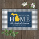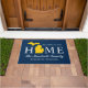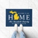Stylish "Welcome to our home" doormat features a typography design with state of Michigan map. Personalize with your family's last name monogram and your city name. Navy blue, maize yellow, and white colours can be customized.