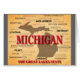 Michigan state pride image including map silhouette with cities, towns and nickname.