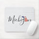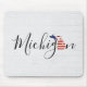 Michigan caligraphy text with state of Michigan flag graphic on whitewashed wood.
