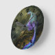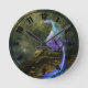 A small blue and purple feathered microraptor sits on a fallen tree in a dense Cretaceous era forest. It looks to the left to show its head in profile as is perches on the log. Its tail curves slightly in the same direction, show off its bright plumage. The twisted trunk of the down tree is covered with moss and shelf fungus. Ferns carpet the primeval forest floor as rays of sunlight cut through the thick green canopy above. The microraptor was one of the smallest of dinosaurs. It was covered in feathers had wings on both it's arms and legs. It is one of the most commonly found fossils.
