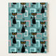 Colourful abstract Mid Century style pattern with black cat, black stars and colourful (blue, white, pink) cubes decoration on turquoise background for every cat lover, cat mom and cat dad.