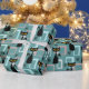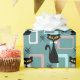 Colourful abstract Mid Century style pattern with black cat, black stars and colourful (blue, white, pink) cubes decoration on turquoise background for every cat lover, cat mom and cat dad.