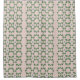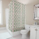 Mid century design pattern shower curtain. Blush pink background with a geometric pattern print in sage green and a matt blue.