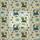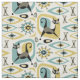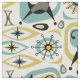 My original vector illustration of mid century style abstract cats, cubes, starbursts, boomerangs, lozenges, and more, in turquoise, gold, warm grey, and black on off white/tan.