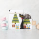 Colorful abstract Mid Century style illustration with black cat, Christmas tree and Christmas gifts decoration