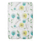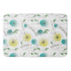 Mid-Century Modern bath mat dandelion clocks, flowers and leaves in shades of yellow and blue on a white background.