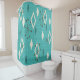 Inspired by 1950s abstract art, this midcentury atomic era design has diamonds and sputnik starbursts. Teal green and turquoise blue.