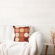 Throw pillow in a Mid-Century Modern geometric print of giant dots, in a grid of nine coordinating colours - shades of tan, dark brown, rust, terracotta and cream, on a chocolate brown background