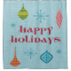 A mid century modern inspired Christmas design with colourful Christmas tree ornaments and sputnik starbursts, against a light blue background.