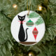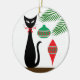 Here is my mid century modern black cat sitting next to his two favorite ornaments on the Christmas tree. He loves the retro look of these, and the bright green and red colors. The holidays are his favorite time of year, but he does wish his owners would not tie the red bow around his neck. It tickles!