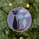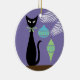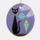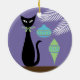 Here is my mid century modern black cat sitting next to his two favorite ornaments on the Christmas tree. He loves the retro look of these, and the blue and green colors. The holidays are his favorite time of year, but he does wish his owners would not tie the bow around his neck. It tickles!