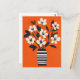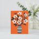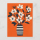 A lush tangerine floral crown in a navy striped vase commands attention against a calm sky blue backdrop.